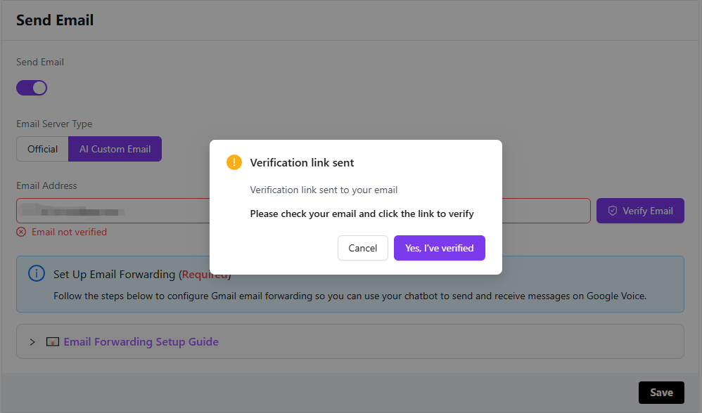 Click the Verify Email button, and you will see a pop-up dialog.